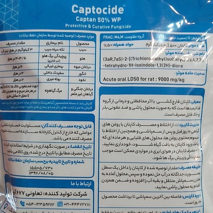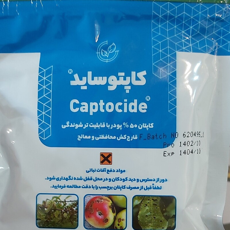 قارچ کش کاپتان شرکت آریاشیمی اثر بخش برای انواع مشکلات قارچی درختان و انواع گیاهان آپارتمانی مانند لکه سیاه سیب، لب شتری هلو، بیماری غربالی درختان میوه، سفیدک داخلی انگور، بوته میری نخود ، و همچنین ضد عفونی نمودن خاک