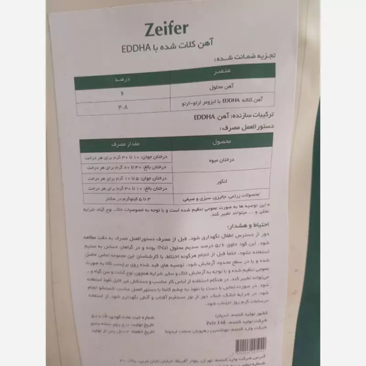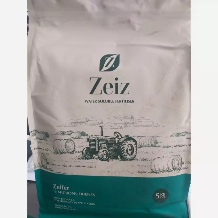 کود آهن زایز انگلستان محصولی با 6 درصد آهن محلول در آب و 4.8 درصد آهن کلاته EDDHA با ایزومر اورتو-اورتو که با جذب سریع توسط گیاه بسیار موثر در رفع کمبود گیاه می باشد.