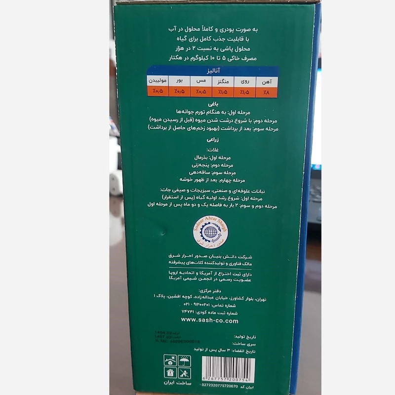 حاوی عناصر ریزمغذی مورد نیاز انواع گیاهان شامل اهن، روی، منگنز، مس، بور، مولیبدن